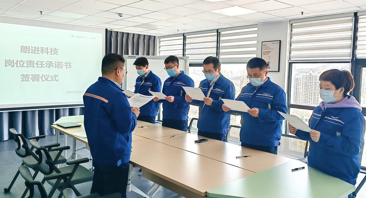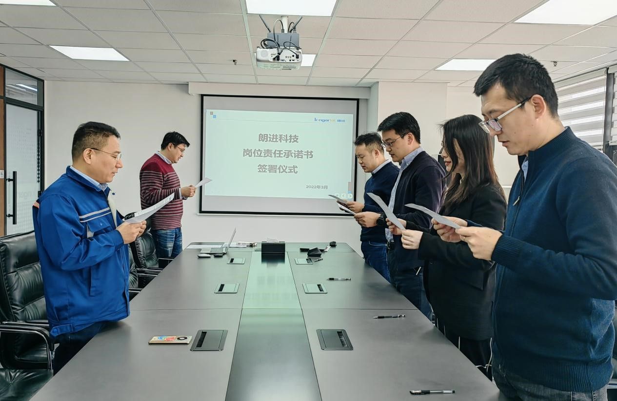 為明確工作職責(zé),強化執(zhí)行落實,確保朗進科技2022年度各項工作有序高效推進?;谝咔樵?,自3月21日起,由人力行政部組織,各中心各部門負(fù)責(zé)人分批在青島軟件園20層會議室和萊蕪工業(yè)園會議室參加了2022年度崗位責(zé)任承諾書簽訂儀式,公司總經(jīng)理李敬恩全程參與。