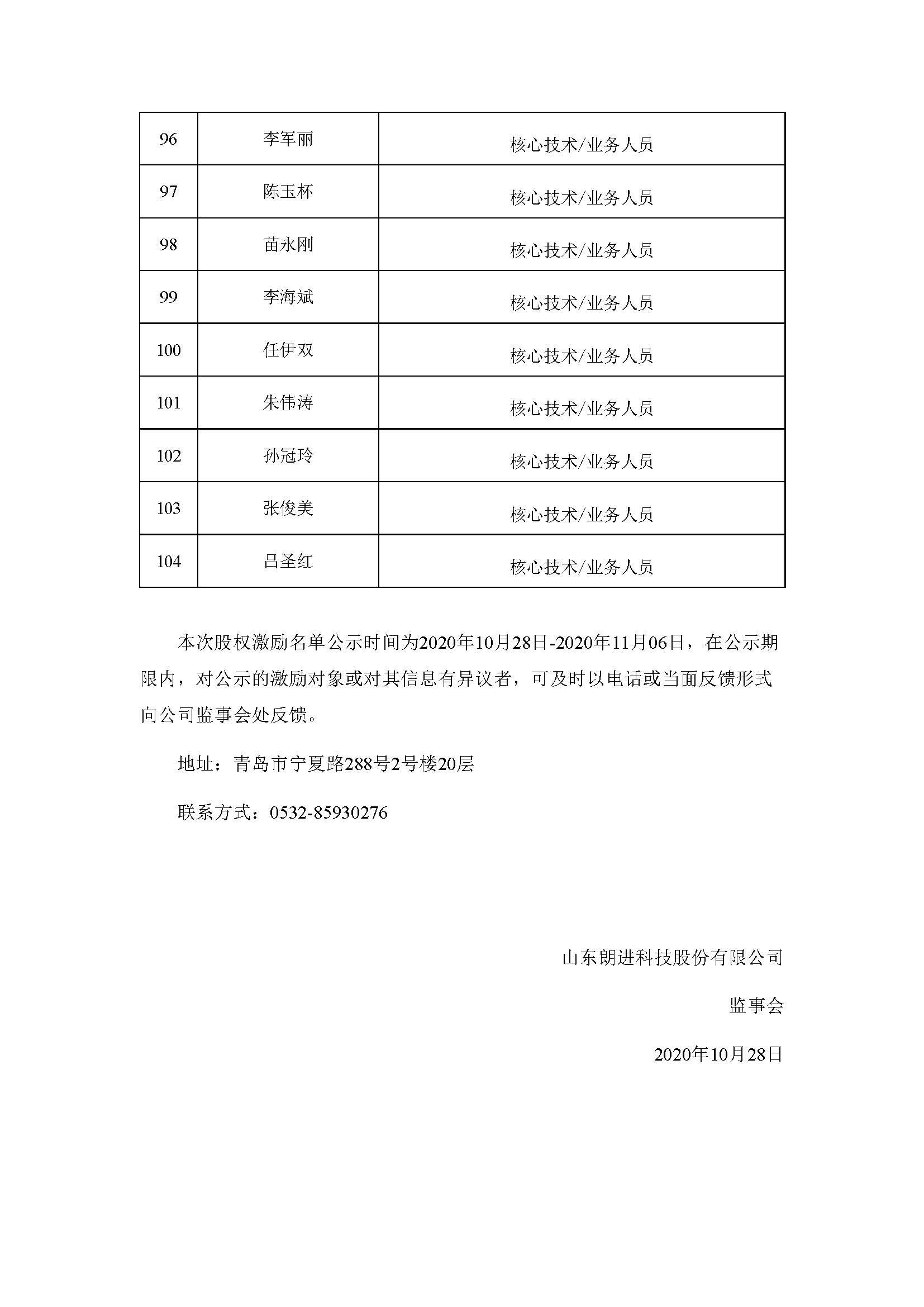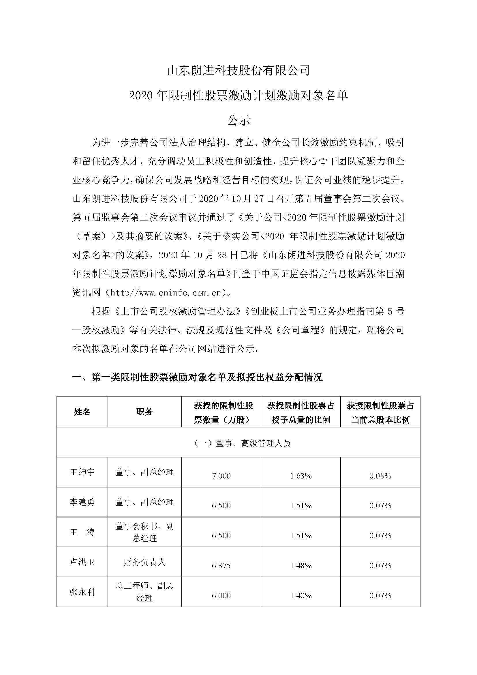 山東朗進(jìn)科技股份有限公司2020年限制性股票激勵(lì)計(jì)劃激勵(lì)對(duì)象名單公示 2020-10-27