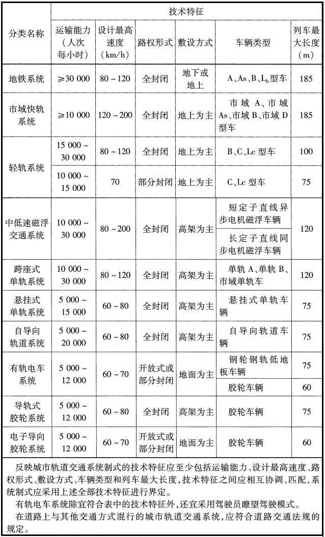 城市軌道交通按照空間范圍劃分為城區(qū)軌道交通和市域軌道交通兩類。各分類的技術(shù)特征見下表: