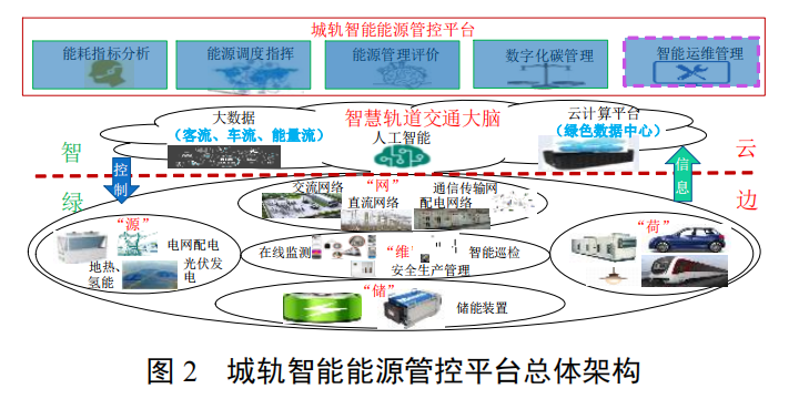 (3)綠色運營管理平臺。基于線網城軌云平臺和大數據平臺的云數融合底座綜合承載,圍繞“能源全面感知、節能數據驅動”目標,構建匹配“線網-線路-站段”管理架構的智能能源管理平臺。線網級側重能源智能管理決策與評價,線路級側重能源綜合調度管理,站段級側重能源系統互通互濟、源網荷儲協調互動調節,以智慧賦能能源的精細化管理,綠智融合,提升能耗計量和碳排放監測等智能能源管理能力,總體架構見圖 2。